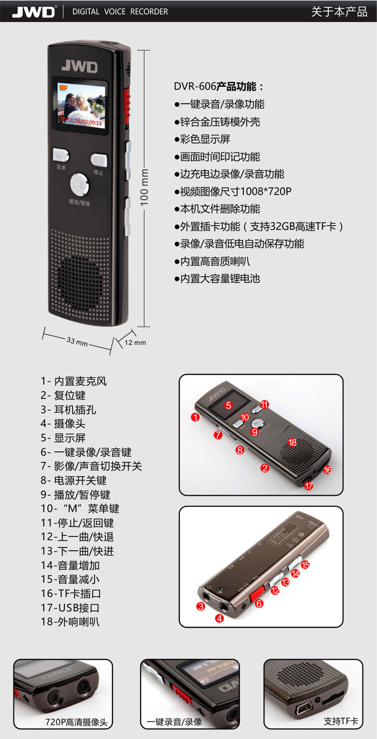 錄像時間約:7小時/3.5小時(分辨率1008*720P)