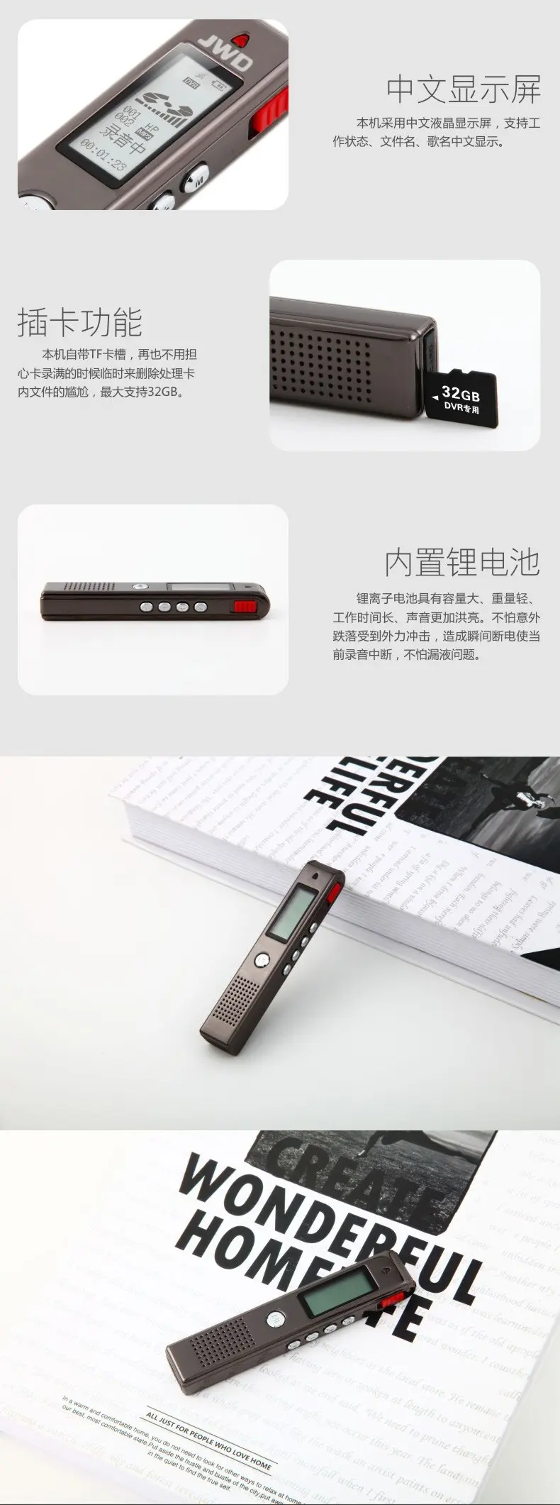 高靈敏麥克風,快速一鍵錄音,A-B復讀,支持存儲卡取換,斷電低電保護,支持存儲卡取換