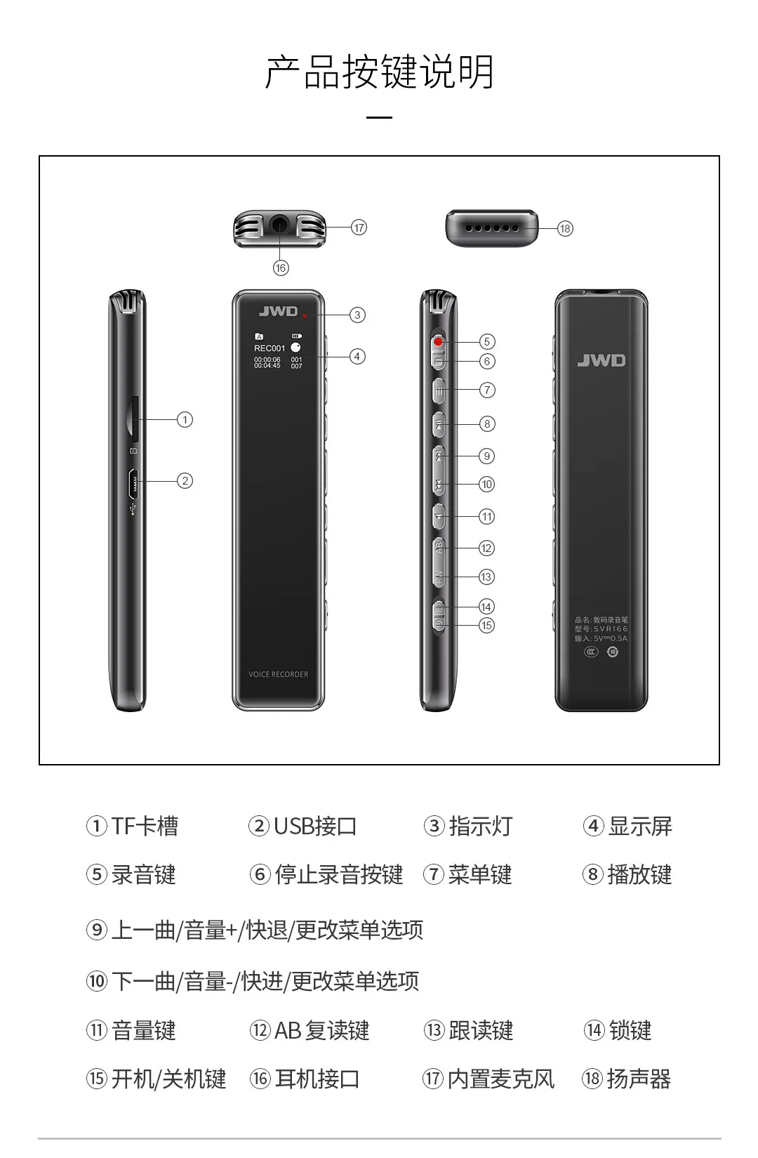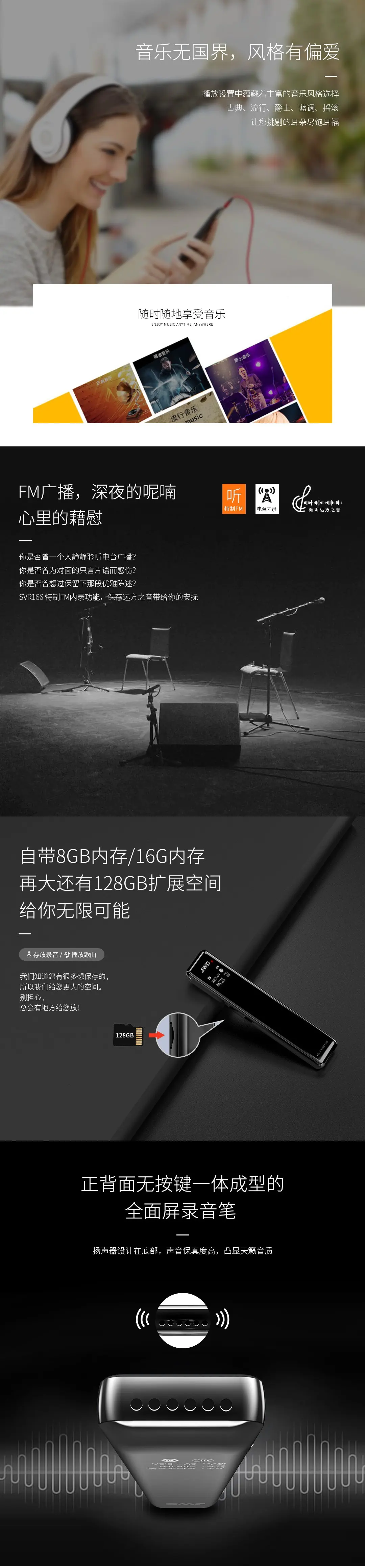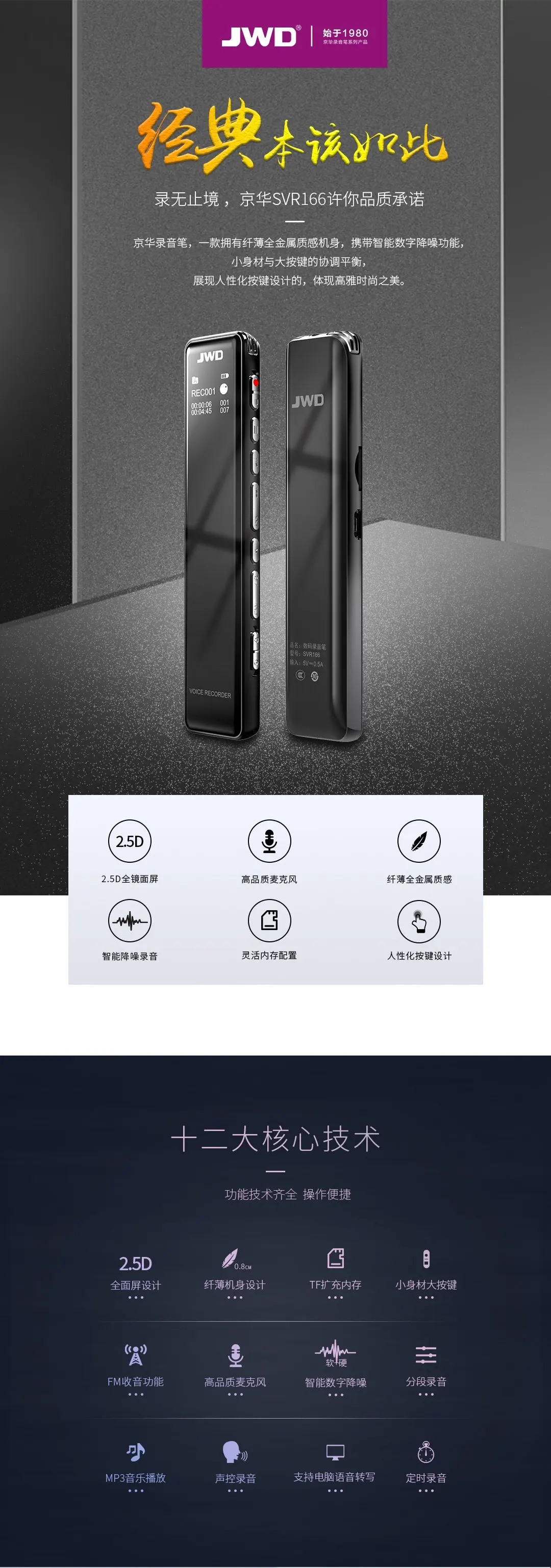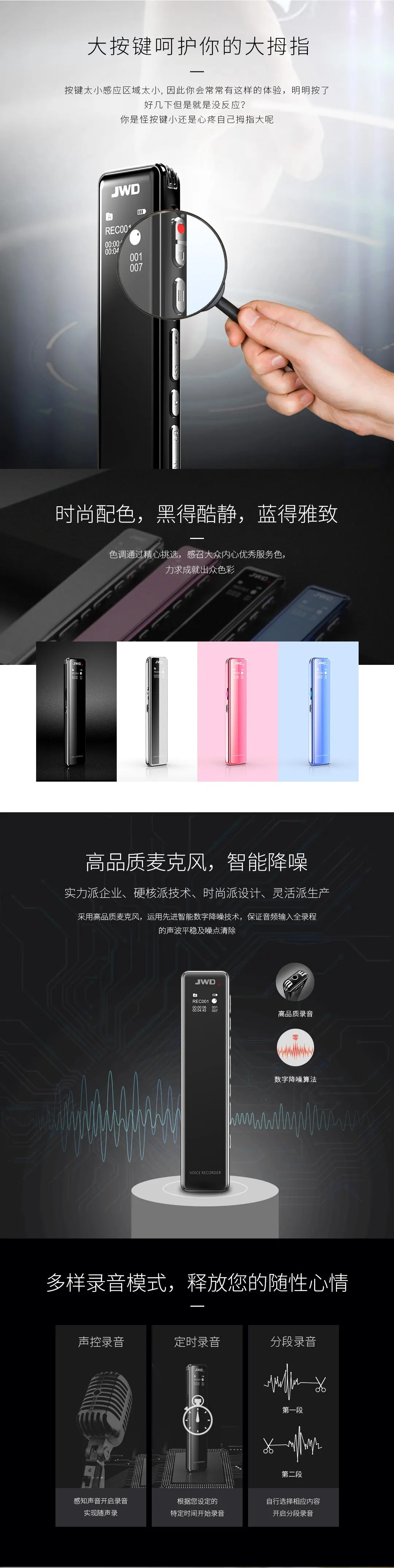2.5D全鏡面顯屏,高品質麥克風,支持TF卡取換,人性化按鍵設計,智能數字降噪