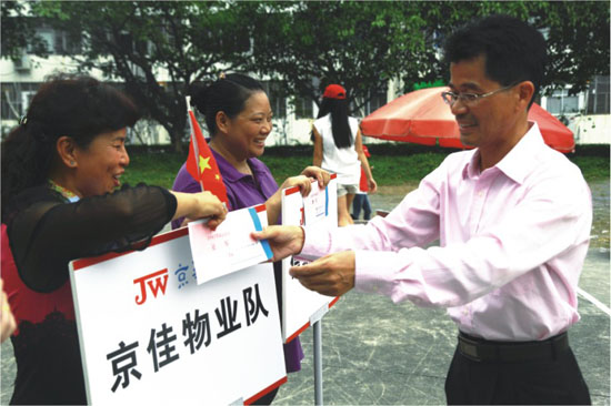 10月26日,最后一個比賽日。進行了拖拉機、同心協力、托運大氣球、拔河等4個項目的決賽。最為緊張刺激的是下午的拔河比賽。根據比賽規則每隊5男5女共10個人,采取3局兩勝的淘汰賽制。最后京佳物業隊與信息好運隊狹路相逢。兩隊展開了你爭我奪,雙方運動員都鉚足了勁,相互實力勢均力敵。在幾百名拉拉隊員震耳欲聾的加油聲中,雙方隊員互不相讓,寸土必爭。出現了長時間僵持不下的狀況。經過三局激烈的爭奪,最后京佳物業憑借牛高馬大、耐力超強的保安人員為主要陣容,一舉拿下了冠軍寶座。