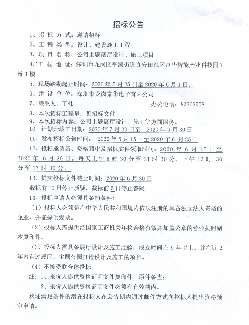 京華科技園大門及功能用房重建工程中標(成交)結果公示