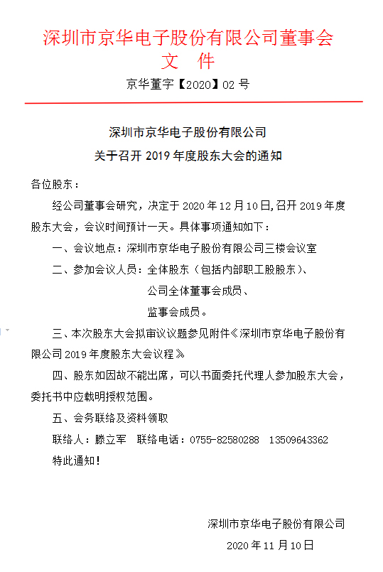 深圳市京華電子股份有限公司關(guān)于召開2019年度股東大會(huì)的通知