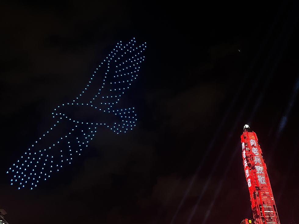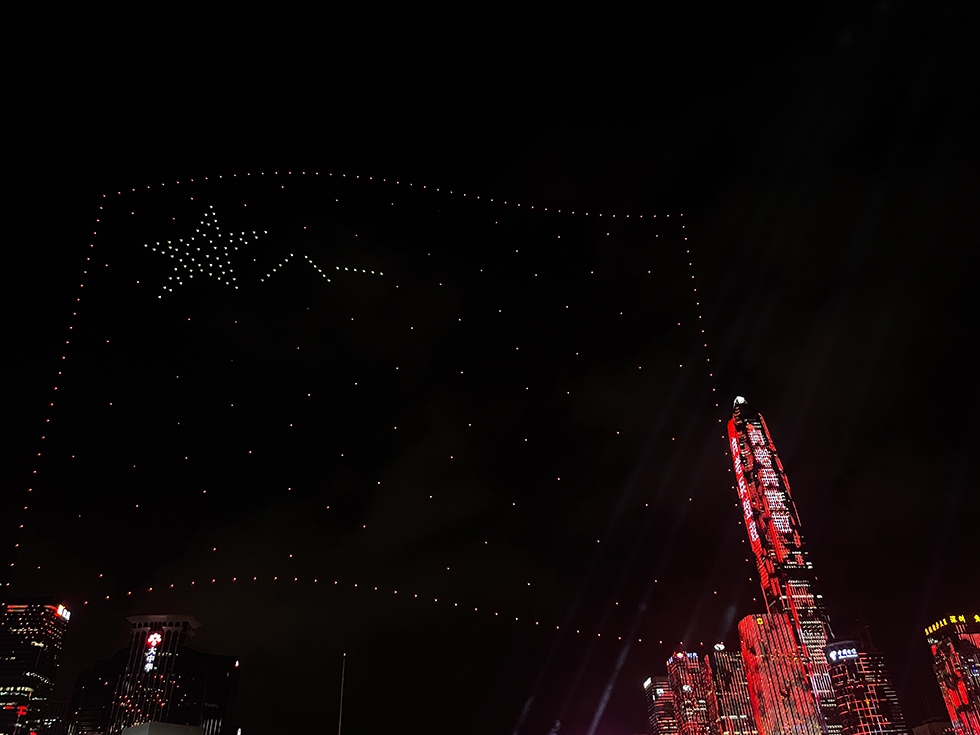 夜幕降臨,軍號響起,儀仗兵向老兵致敬。市民中心廣場周邊的樓宇建筑瞬間被耀眼奪目的燈光點亮,“老兵你好”“向老兵致敬”等宣傳標語映紅天際。千部無人機騰空而起,在夜空中靈動飛舞,先后編排出改革開放45周年、大鵬展翅、軍號、八一軍旗等造型畫面與市民中心廣場絢麗的舞臺交相輝映。參加節(jié)目錄制的老兵們身著戎裝,與市民群眾共賞這場光影盛宴。