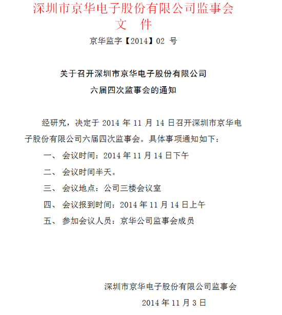 關于召開深圳市京華電子股份有限公司六屆四次監事會的通知